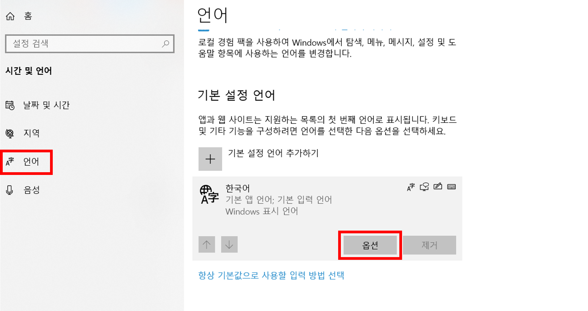 3. '언어'를 누르고 '기본 설정 언어'에서 '한국어'를 눌러 '옵션'에 들어간다.